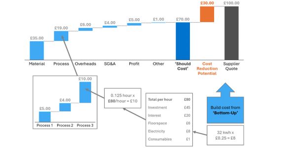 As shown in the chart, there is usually a substantial gap between the 'should cost' and the supplier quote.
