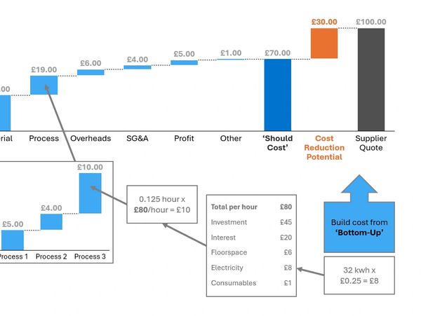'Should Cost' is a detailed calculation of all costs associated with manufacturing a product. It is independent, based on proven benchmarks and factual data—not supplier quotes.